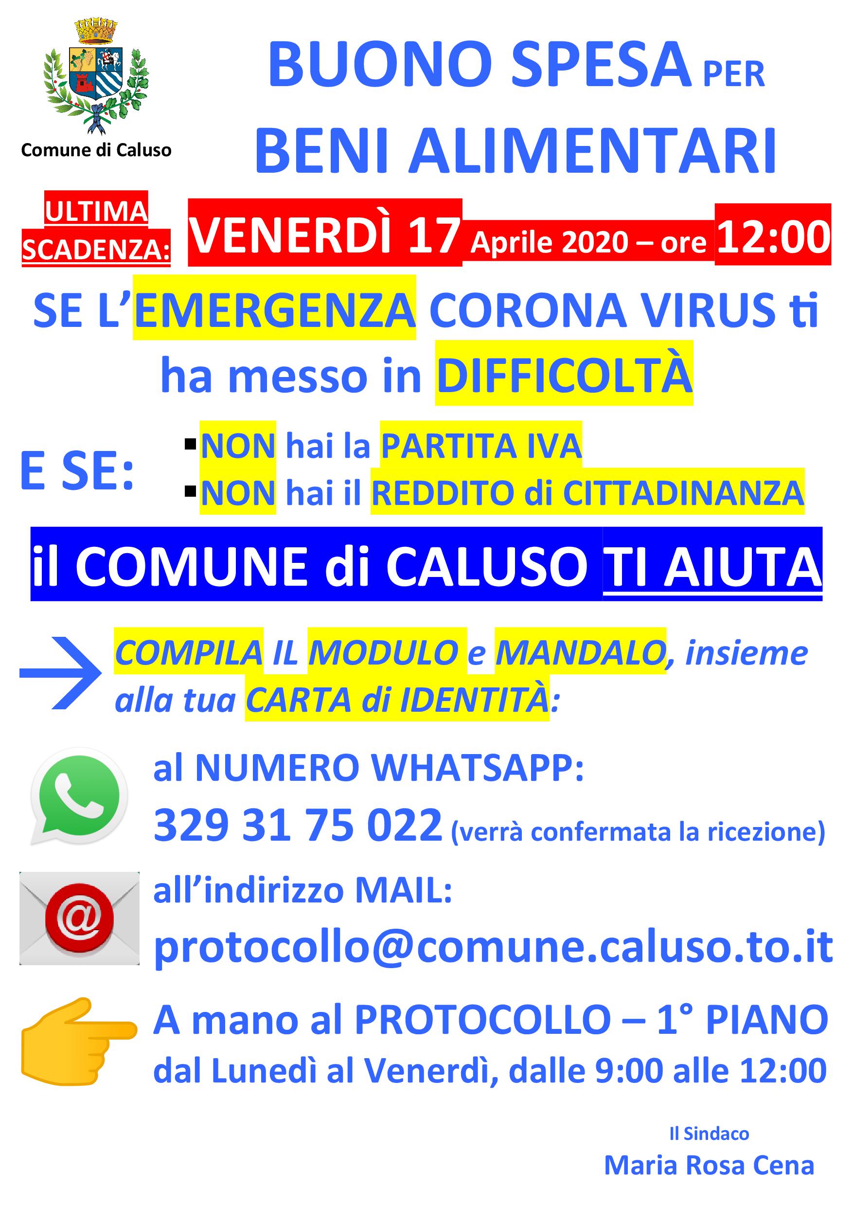 ULTIMA SCADENZA per richiesta buoni spesa generi alimentari al Comune di Caluso Venerdì 17 Aprile 2020 - ore 12:00